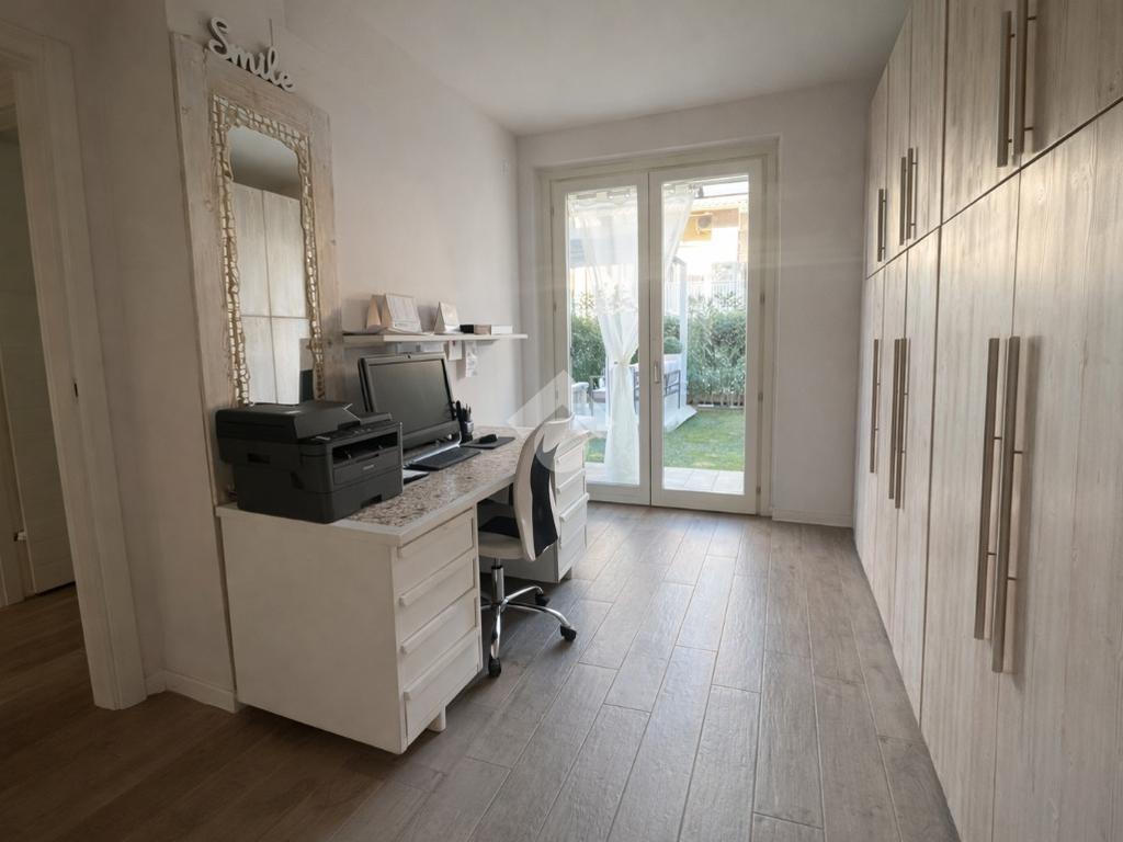 La zona notte si divide in camera matrimoniale generosa nelle dimensioni e cameretta ideale per figli, studio o ospiti, entrambe le stanze possiedono porte finestre con affaccio diretto sul giardino retro. Il bagno finestrato garantisce luce naturale e comfort.