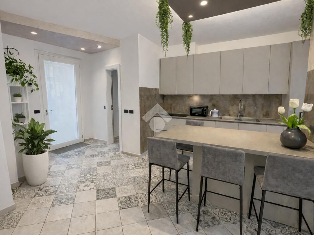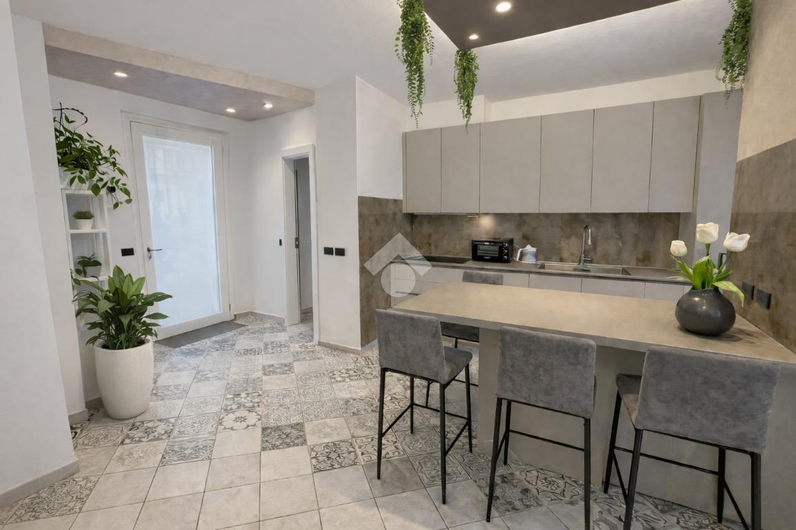 Il piano principale accoglie un ampio openspace con soggiorno e cucina con pavimento patchwork, uno spazio moderno e accogliente perfetto per la vita quotidiana e per ricevere ospiti.